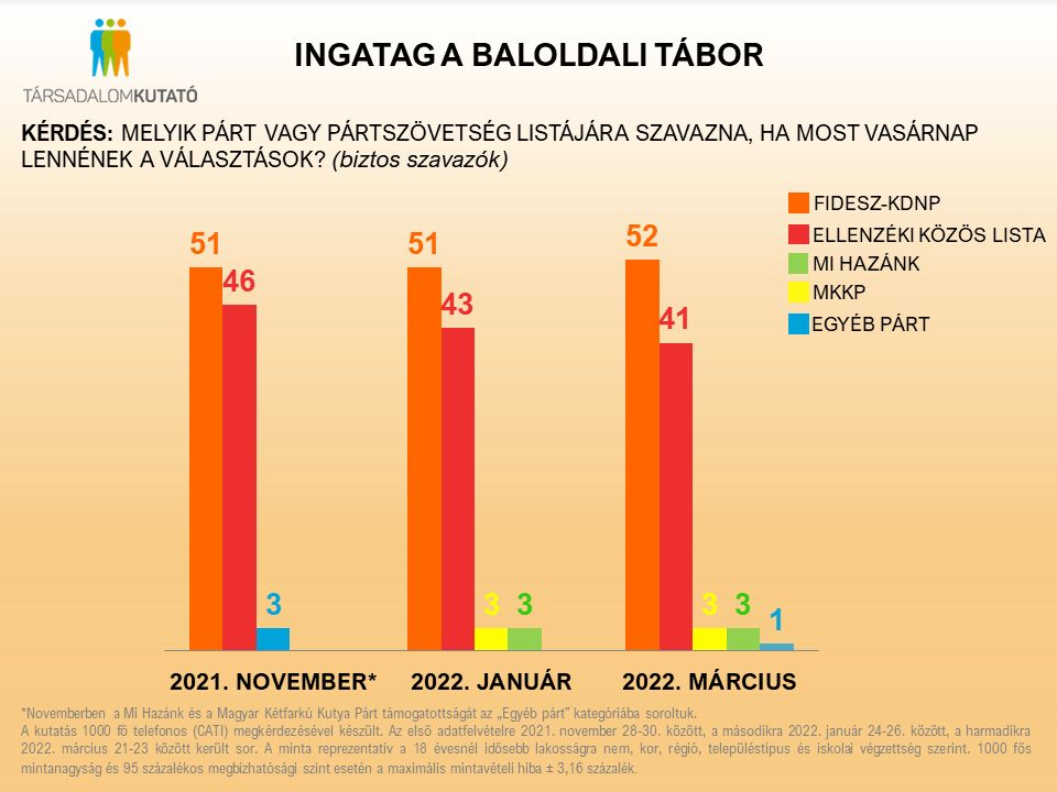 A Társadalomkutató friss felmérése stabil Fidesz-vezetést jelez 11 nappal a választások előtt. A Fidesz-KDNP pártszövetség egy „most vasárnapi” országgyűlési választáson a szavazatok 52, míg az ellenzéki összefogás a voksok 41 százalékát szerezné meg. A baloldal november óta sem tudott lendületet venni, támogatottságuk csökkenésének tendenciája tartósnak mondható. További problémát jelent számukra, hogy szimpatizánsaik jelentős része peremszavazó.