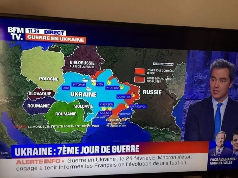 Az egyik francia hírcsatorna, a BFM TV a háborúról tudósított. Térképpel magyarázták el a jelenlegi ukrán helyzetet.
