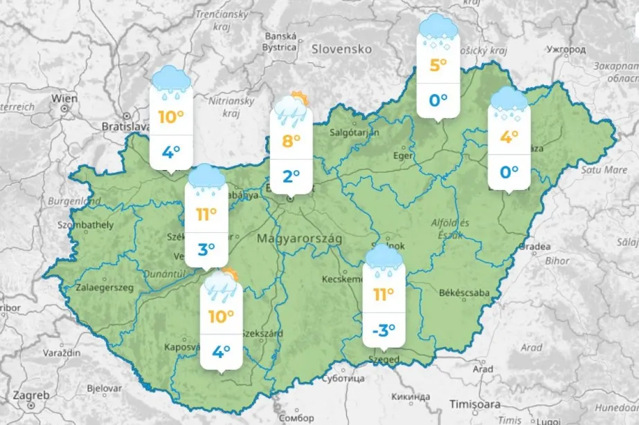 Hajnalban a DNy-i tájakat leszámítva többfelé várható eső, északkeleten havas eső, hó sem kizárt. Majd reggeltől keletre szorul vissza a csapadék. A déli óráktól ÉK felől szakadozik a felhőzet, de egy-egy zápor még ekkor is előfordulhat. Az északi szél megerősödik. 5 és 13 fok közé csökken a hőmérséklet.