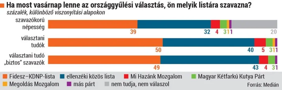Érdekesség, hogy a HVG felkérésére készült Medián mérésben ezúttal a Mi Hazánk Mozgalom (4%) közelebb áll a parlamentbe jutáshoz, mint a Kétfarkú Kutya Párt (3%), emlékezetes Hann Endréék beszéltek először arról, hogy a viccpárt akár be is juthat a következő Országgyűlésbe.