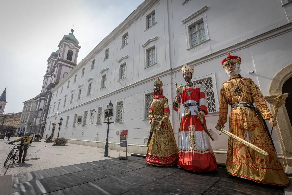 Az érkezőket királyi óriásbábok fogadták: a Magyar Szent Család – Szent István, Boldog Gizella és fiuk, Szent Imre – mellett Szent László, Könyves Kálmán és II. András óriásbábja sorakozott fel az épület előtt.