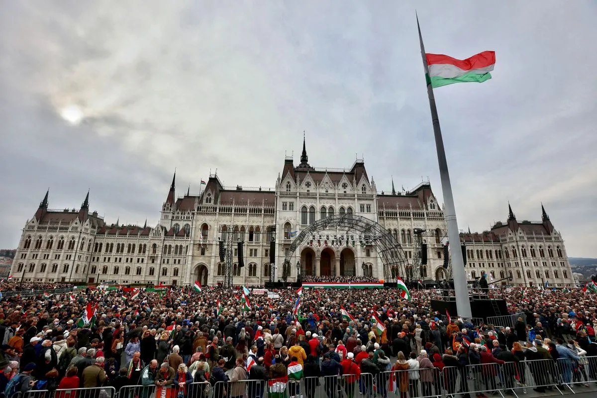 Több százezer ember indult meg Budáról, hogy a Kossuth térre érve együtt hallgassák meg Orbán Viktor beszédét.