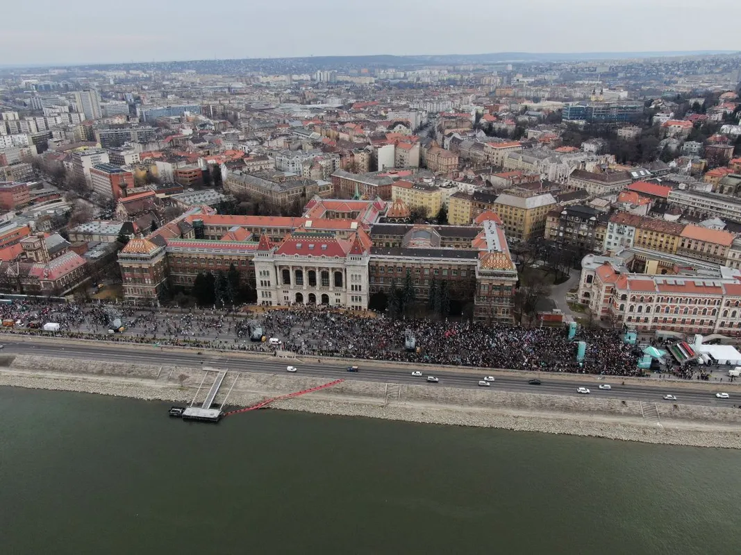 Eközben Ellenzéki nagygyűlést is hirdettek a fővárosi Műegyetem rakparton. Az MTI által kiadott légi felvételen egyértelműen látszik, hogy milyen nagy a két gyűlés iránti érdeklődés közötti különbség.