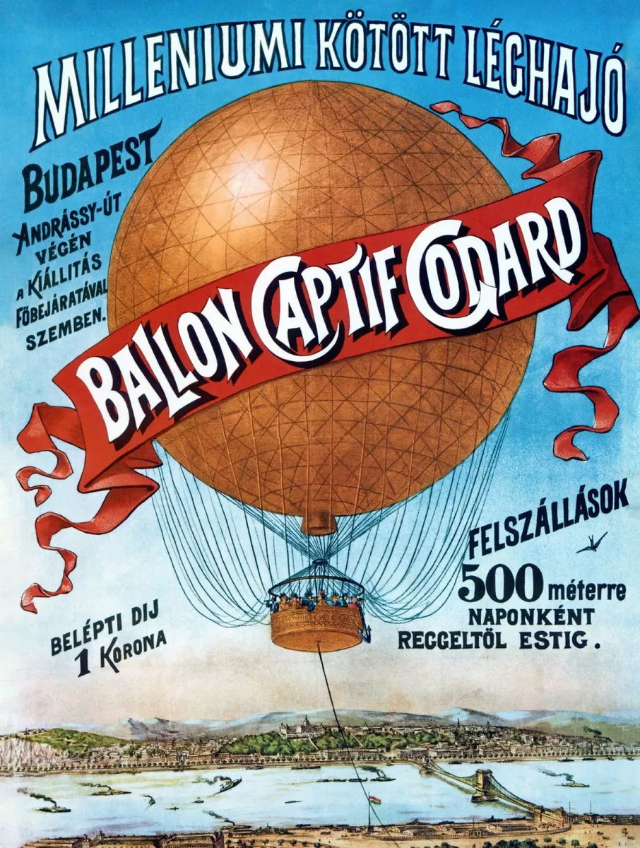 A főváros fölé emelkedő ikonikus szerkezet, a Ballon Captif az 1896-os millenniumi ünnepségek idején egyszerre 12-14 utast röpített szinte hihetetlen, félezer kilométeres magasságba, naponta tucatnyiszor. A Városligetben rendezett Ezredéves Kiállításon a modern technikát a párizsi léghajós, Louis Godard kapitány működtette.