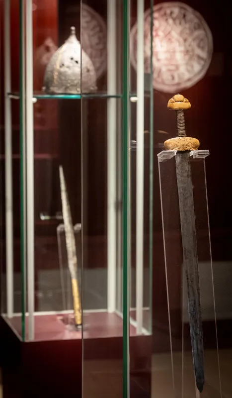 A kiállítás egyik különlegessége Szent István kardja, amely Prágából érkezett Székesfehérvárra. A fegyver egykor Gizella hozománya lehetett. István a még apja által létrehozott német szövetségnek köszönhetően megjelenő, nehézfegyverzetű lovagok segítségével legyőzte trónkövetelő nagybátyját, Koppányt és befejezte központosító harcait. Mögötte látható az egyetlen fennmaradt Árpád-kori sisak.