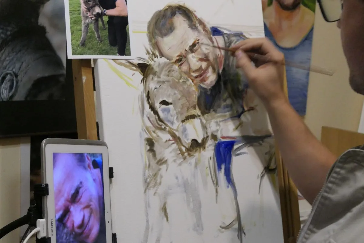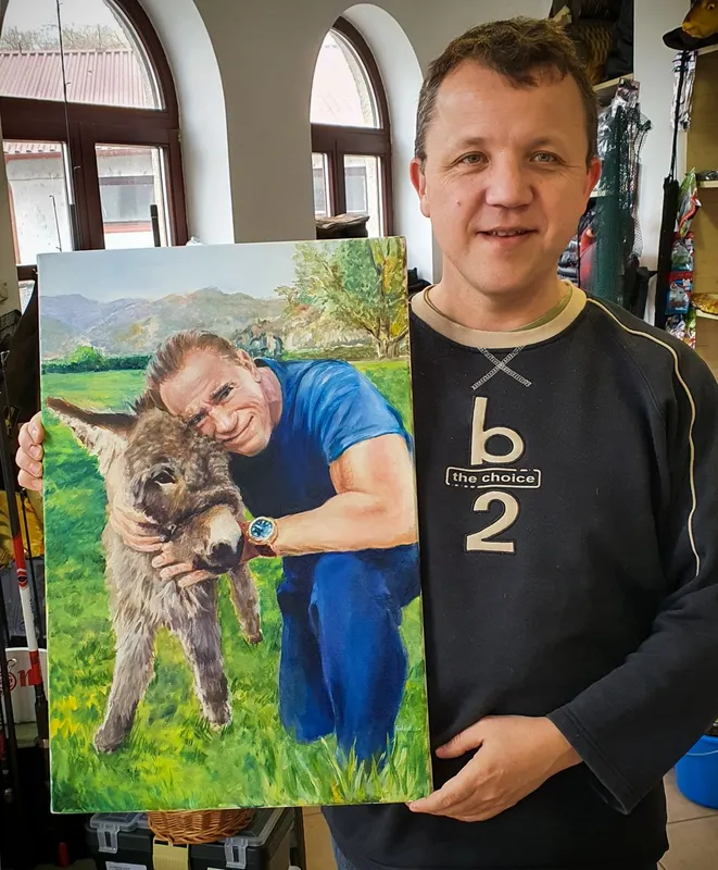 Egyedülálló festménnyel lepték meg Arnold Schwarzeneggert. A Terminátor annyira megörült kedvenc szamarával közös portréjának, hogy kaliforniai házában is kitette a magyar művész, Fent Győző alkotását.