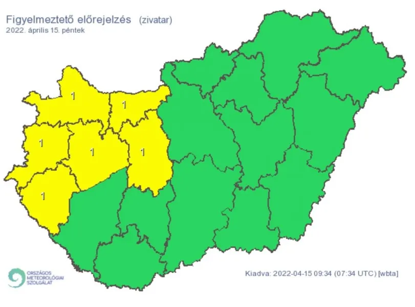 Az Országos Meteorológiai Szolgálat figyelmeztetése szerint pénteken napközben hidegfront érkezik az országba. A hidegfront mentén alacsony, majd mögötte a délutáni, esti órákban elsősorban a Dunántúl északi és nyugati megyéiben nagyobb valószínűséggel alakulhatnak ki a záporok mellett zivatarok. Az intenzívebb gócokat intenzív csapadék (lokálisan 10-20 mm), apró szemű jég és esetleg szélerősödés kísérheti.