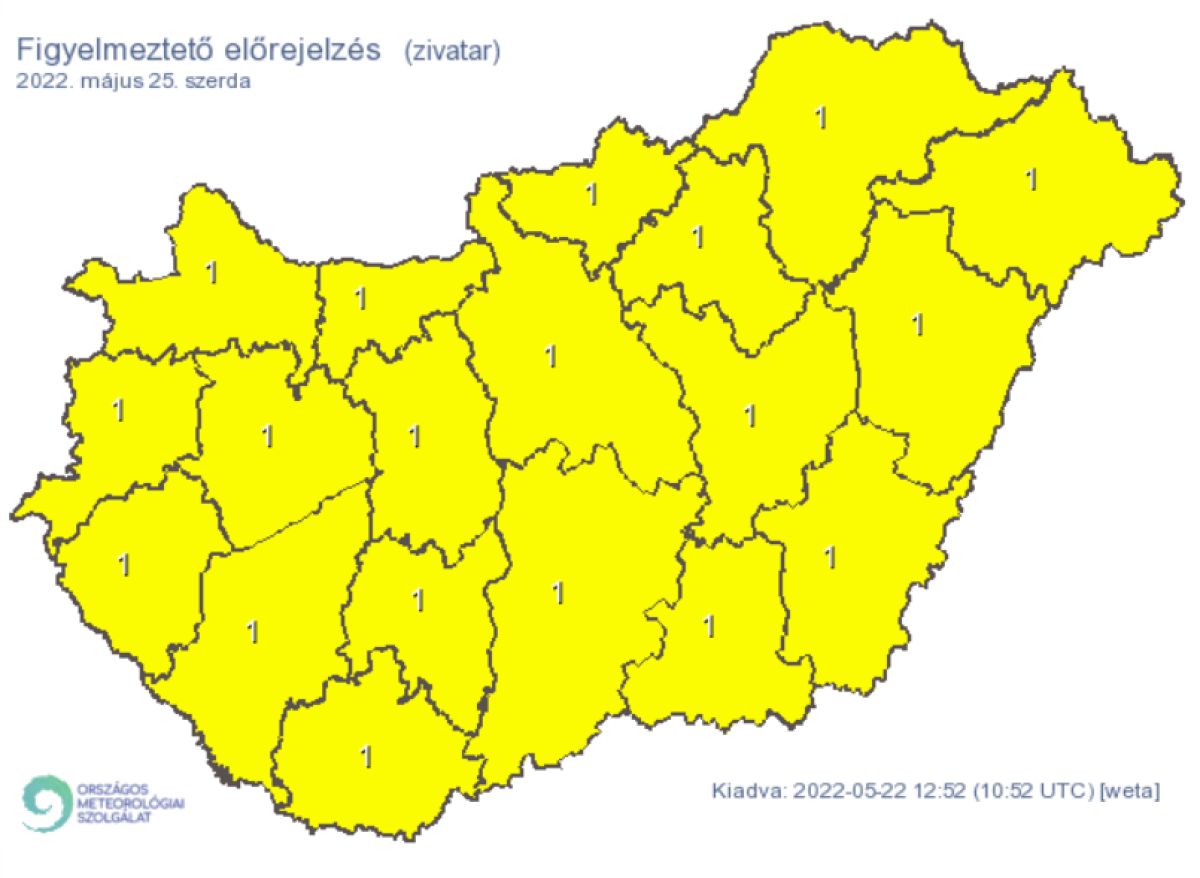 Kedden aztán a nap első felében az erősen felhős égből több helyen várható eső, zápor, zivatar; majd délután csökken a felhőzet. 20 és 26 fok közé csökken a hőmérséklet. Az északkeleti szél élénk lesz. Az Országos Meteorológiai Szolgálat keddre és szerdára figyelmeztető előrejelzést adott ki zivatar miatt az egész országra.