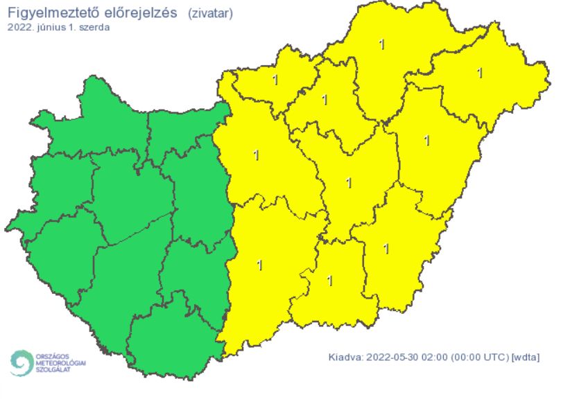 Szerdán a fél országra figyelmeztető előrejelzést adtak ki zivatar miatt. A hajnali, reggeli záporok, és zivatarok elvonulása után sok napsütés várható, délelőttől már nem lesz csapadék. 25-27 fok köré melegszik a levegő. Eleinte lehet élénk az ÉNy-i légmozgás.