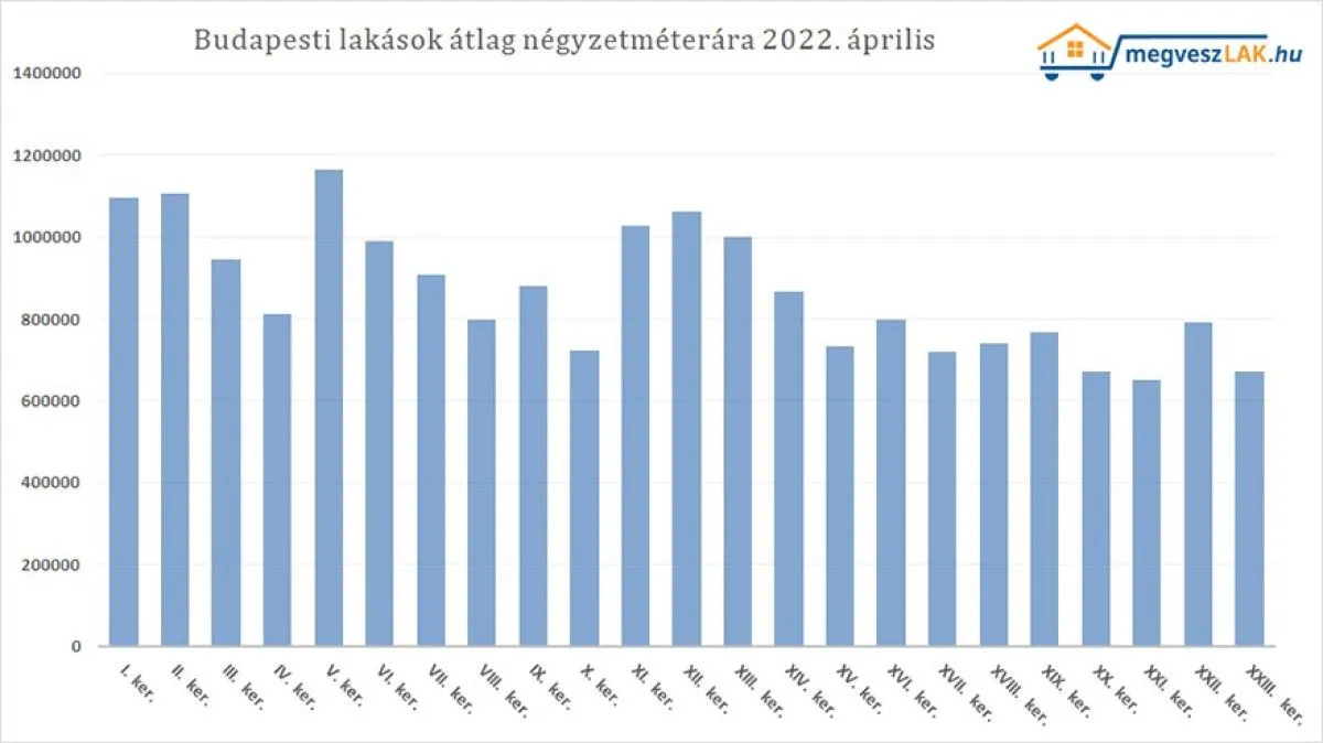 2021 májusában a legdrágább kerület még az I. kerület volt, de idén áprilisra két kerület is megelőzte. A legdrágább kerület áprilisban az V. kerület lett. A második helyre a II. kerület kúszott fel. Az I. kerület visszacsúszott a 3. helyre. Hamarosan valószínűleg már a kerületek felében kell egymilliónál is többet leszurkolni a lakások négyzetméteréért.