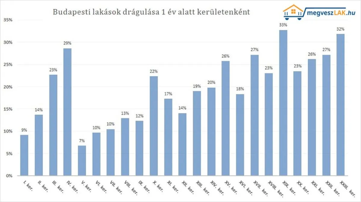 Budapesti lakások drágulása kerületenként az utóbbi 1 évben