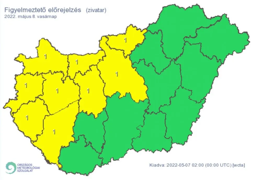 Pest, Baranya, Borsod-Abaúj-Zemplén, Fejér, Győr-Moson-Sopron, Hajdú-Bihar, Heves, Komárom-Esztergom, Nógrád, Somogy, Szabolcs-Szatmár-Bereg, Jász-Nagykun-Szolnok, Tolna, Vas, Veszprém és Zala megye területén zivatar alakulhat ki. Ezeken a területeken az elsődleges veszélyforrást a villámlás jelenti, de esetenként jégeső is előfordulhat. Többfelé élénk lehet a szél, de záporok, zivatarok környezetében erős, viharos lökésekre is számítani kell.