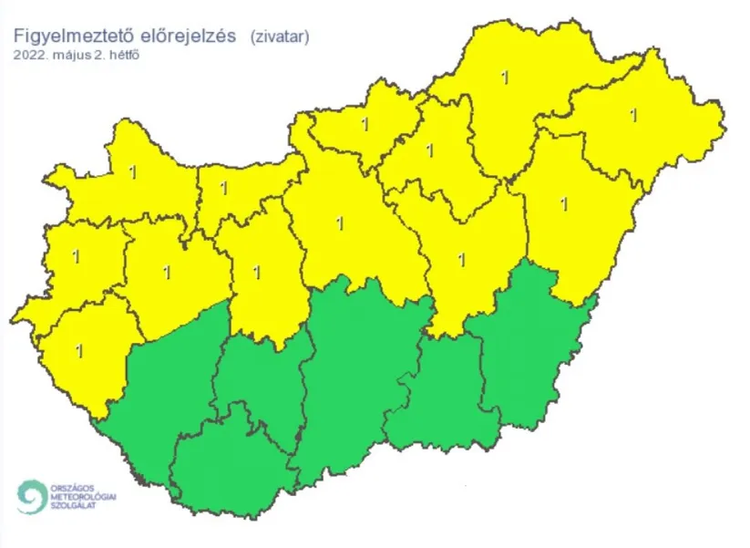 Az északnyugati megyékben nagyobb, másutt kisebb az esély, hogy a záporok mellett dörgés, villámlás előforduljon. Éjszaka már nem valószínű zivatar. Hétfőn a déli óráktól nagyobb számban az ország északi felén ismét kialakulhatnak zivatarok. Egy-egy erősebb gócot szélerősödés (~ 45-55 km/h), intenzív csapadék (~ 15-20 mm), esetleg apró szemű (< 1 cm) jég kísérhet.