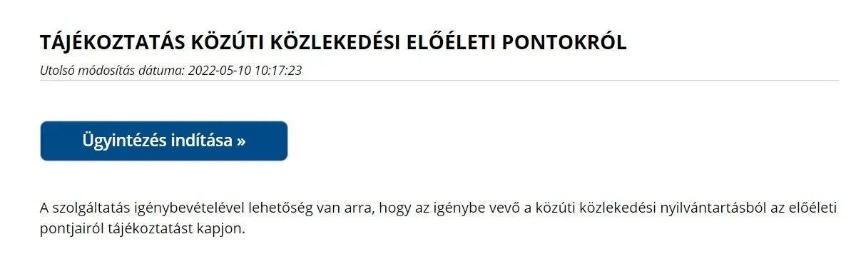 A lekérdezéshez a magyarorszag.hu oldalon a „Közigazgatás, Jog” témacsoporton belül az „Adatkezelés, adatszolgáltatás” felületet kell kiválasztani, majd ott a „Tájékoztatás a közúti közlekedési előéleti pontokról” ügytípust kell kiválasztani. Ezután szükséges az elektronikus azonosítás, majd az „Ügyintézés indítása” gomb megnyomásával az eredmény azonnal megjelenik. Az ügyintézés illeték- és díjmentes.