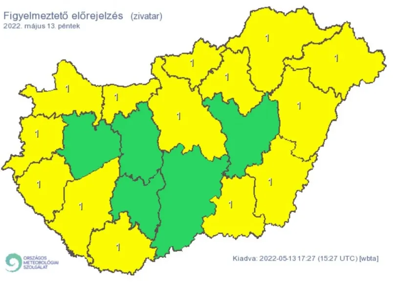 Több megyét érintő figyelmeztetést adott ki az Országos Meteorológiai Szolgálat. Zivatarok alakulhatnak ki Pest, Baranya, Békés, Borsod-Abaúj-Zemplén, Csongrád-Csanád, Győr-Moson-Sopron, Hajdú-Bihar, Heves, Komárom-Esztergom, Nógrád, Somogy, Szabolcs-Szatmár-Bereg, Vas és Zala megyékben. A figyelmeztetés szerint, az elsődleges veszélyforrást a villámlás jelenti, emellett esetenként szélerősödés és jégeső is előfordulhat!