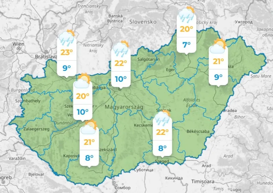Erősen felhős, vagy borult lesz az ég. Eleinte inkább csak a Dunántúlon, majd sokfelé valószínű eső, zápor, zivatar. 15 és 24 fok közé esik vissza a hőmérséklet, a Dunántúlon lesz a hűvösebb.