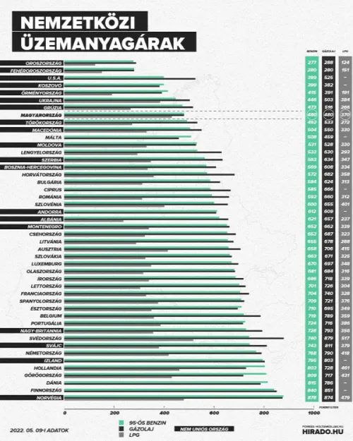 Magyarországon a kormány döntése értelmében továbbra is érvényben van az üzemanyag-árstop, aminek köszönhetően a gázolaj és a benzin ára nem lehet több a literenkénti 480 forintnál. Ez jelenleg az Európai Unió legalacsonyabb üzemanyagárát jelenti, hiszen Nyugat-Európában már van, ahol megközelíti a 900 forintot egy liter üzemanyag ára.