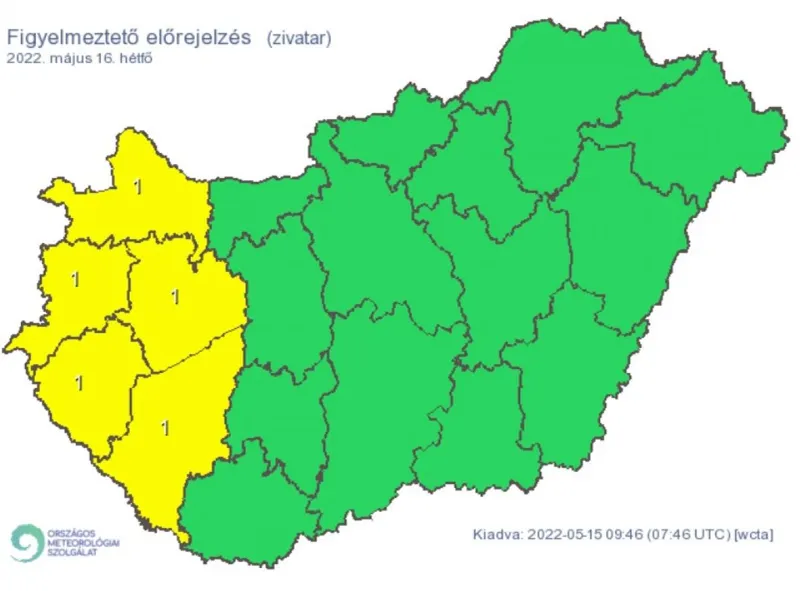 Hétfő nappali gomolyfelhő-képződés várható többórás napsütéssel. Délután a Dunántúl nyugati felén alakulhatnak ki zivatarok, melyeket viharos széllökés (jellemzően 60-70 km/h), intenzív csapadék (helyenként akár >20 mm), és jégeső kísérhet. A nyugati tájakon zápor, vagy zivatar előfordulhat az esti óráktól. 25 és 30 fok között alakul a hőmérséklet.