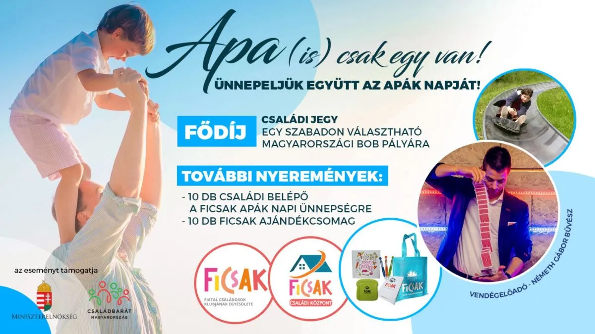 Az értékes fődíj (családi belépő egy szabadon választható magyarországi bob pályára) mellett a FICSAK kisorsol 10 db ajándékcsomagot, valamint 10 szerencsés nyertest, akiket az apák napi rendezvényen június 18-án meghívnak egy családi ünnepségre a Ficsak Családi Központ kertjébe. Az ünnepségen sportos programok, játékos feladatok és Németh Gábor bűvész szórakoztatja majd a gyerekeket. És ha már nyár, akkor a fagylaltozás sem maradhat el a program végén!