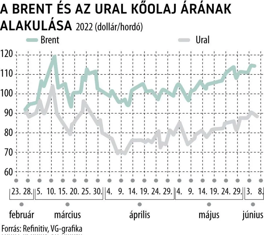 Ezzel szemben az Ural típusú olaj hordónkénti ára csökkent. Február 23-án még 95 dollárt kértek egy hordóért, június 10-én viszont csak 89,3 dollárt. Ez 6 százalékos árcsökkentést jelent. Az árfolyam ingadozó, az elmúlt hetekben enyhe emelkedés volt megfigyelhető, ám az utolsó 2-3 napban ismét csökkent az ár.
