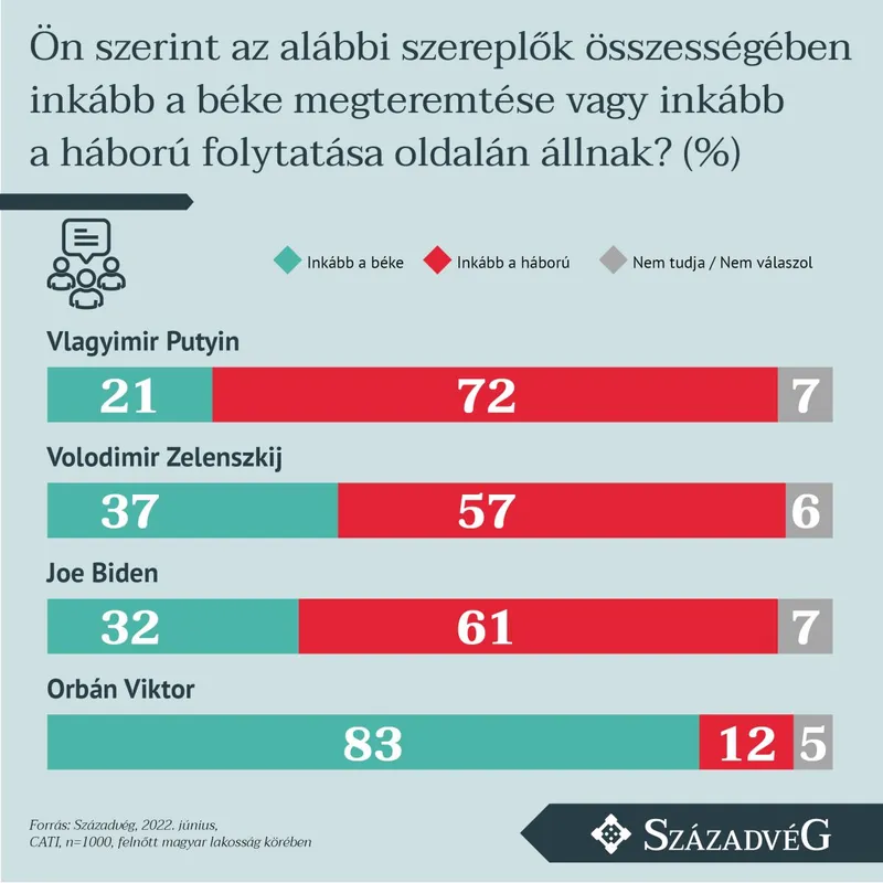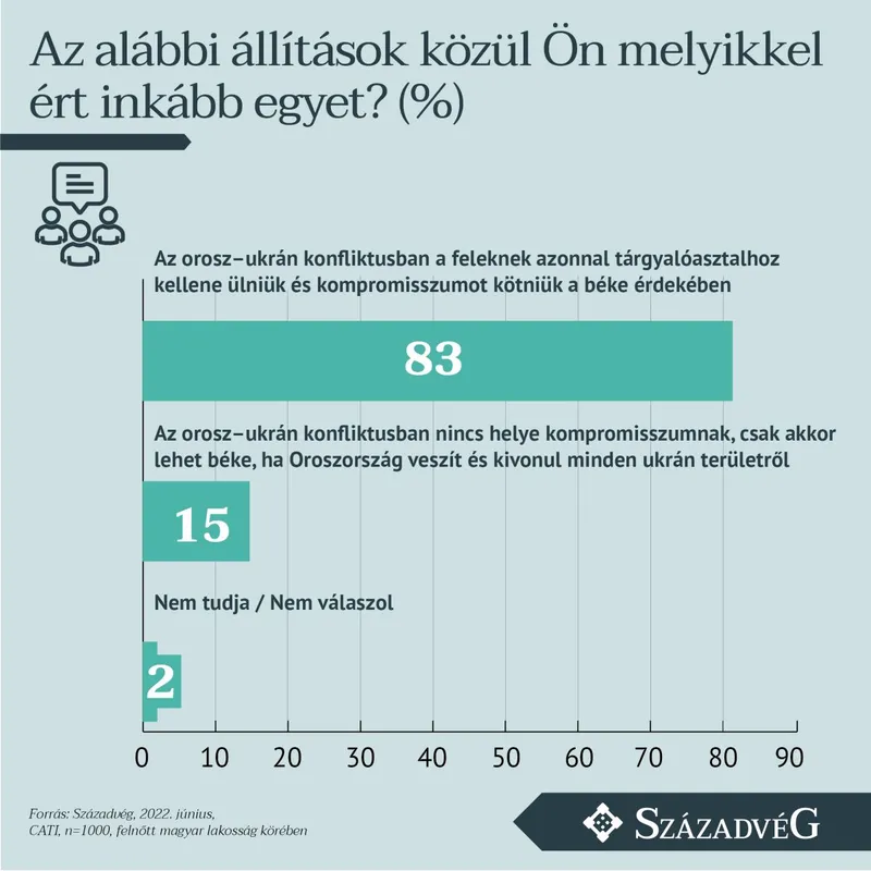 A magyarok 83 százaléka a béke érdekében mielőbbi tárgyalást és kompromisszum elérését sürgeti az orosz–ukrán háborúban, ugyanakkor a döntő többség úgy látja, hogy az érintett felek nem a békekötésben érdekeltek – állapítható meg a Századvég júniusi felméréséből. A közvélemény-kutatás az orosz–ukrán háborúval kapcsolatos lakossági véleményeket vizsgálta.