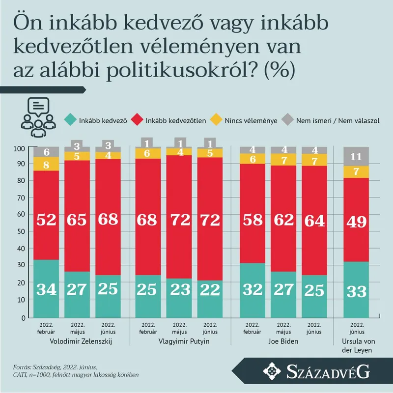 A felmérés rámutat arra, hogy a fegyveres konfliktusban közvetlenül vagy közvetve érintett politikusok megítélése – a májusi adatokhoz viszonyítva – romló tendenciát mutat. A kutatás szerint a Volodimir Zelenszkij ukrán elnökről kedvezőtlenül vélekedők aránya májusról júniusra 65-ről 68 százalékra nőtt, míg Joe Biden amerikai elnök esetében 62-ről 64 százalékra emelkedett.