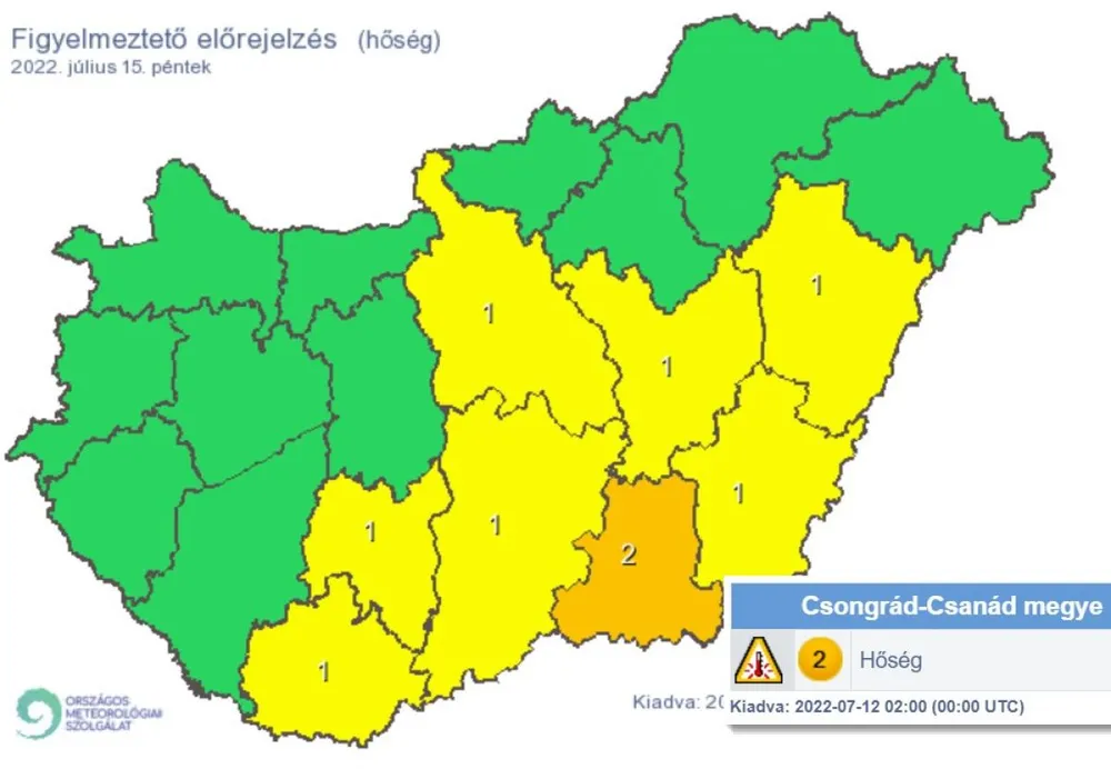 Miközben csütörtökre kilenc megyére (Baranya, Bács-Kiskun, Békés, Csongrád-Csanád, Fejér, Hajdú-Bihar, Jász-Nagykun-Szolnok, Pest és Tolna megye) adtak ki a hőség miatt elsőfokú riasztást, péntekre Csongrád-Csanád megyében másodfokú riasztás várható, szintén a hőség miatt – vagyis a napi középhőmérséklet 27 fok felett valószínű.