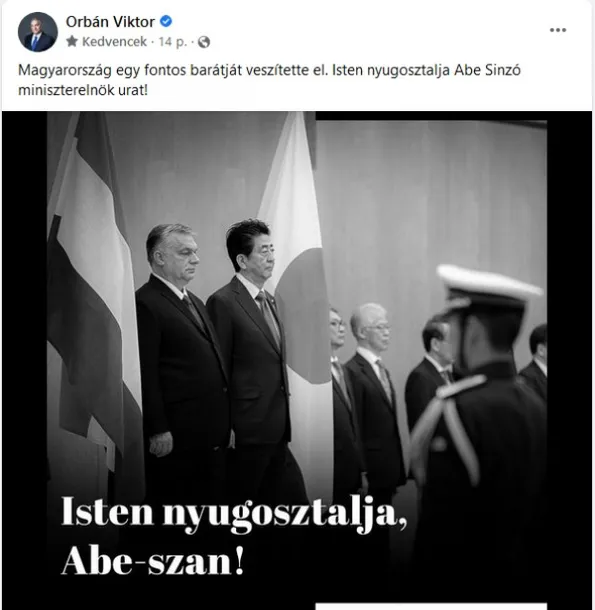 Magyarország miniszterelnöke közös képpel emlékezett meg az agyonlőtt Abe Shinzóról.