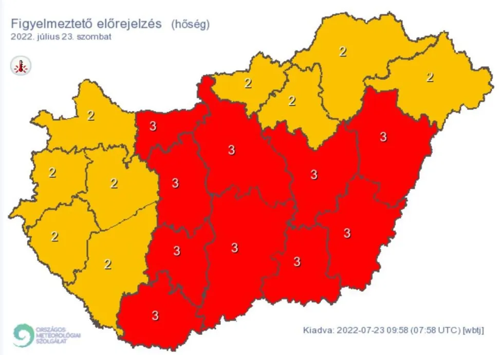 A hőség miatt Magyarország egészére figyelmeztető előrejelzést adtak ki, a legsúlyosabb a helyzet az ország középső részén, ahol a legmagasabb, harmadfokú riasztás van érvényben tíz megyében. Érdekes, hogy ezzel párhuzamosan zivatarveszélyre is figyelmeztetnek az ország teljes északi és nyugati felében. Késő délután a Dunántúlon heves zivatarok kialakulására is van esély, emiatt akár a narancs fokozatot is kiadhatják. A késő esti órákra átmenetileg csökken a zivatarok száma, majd az éjszaka második felében nyugat felől újabb zivatarok érkezhetnek. Vasárnap napközben elsősorban a déli és keleti tájakon alakulhatnak ki zivatarok, ami az esti órákra lecseng.