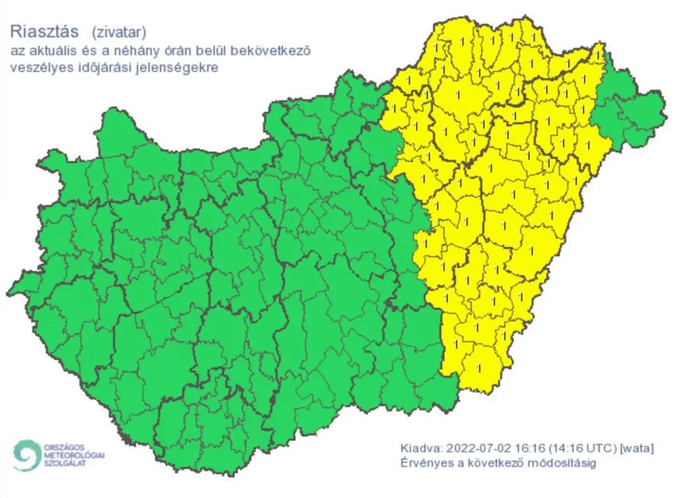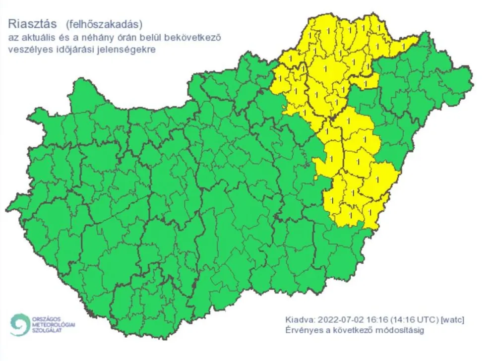 Az Országos Meteorológiai Szolgálat több megyére is elsőfokú riasztást adott ki felhőszakadás és zivatar miatt. Mint írták, néhány órán belül bekövetkezhet a vihar, viharos szél és jégeső is lehet.