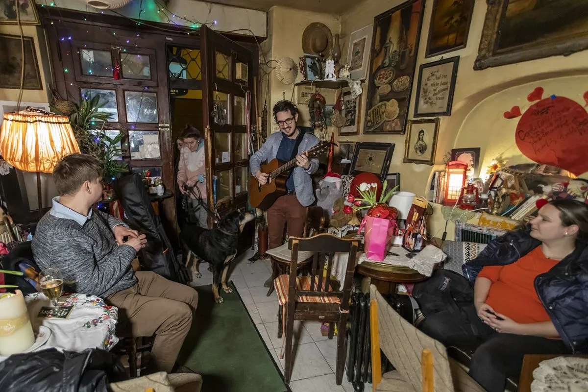 „Voltak barátaink, művészemberek például, akik majd éhen haltak. Gondoltam kell egy hely, ahol ők eladhatják a képeiket, a munkáikat miközben a vendégek esznek-isznak valamit. Hajnalban bejön valaki negyed 4-kor, az kap egy jófajta kacsazsíros kenyeret lilahagymával, de ha szerencséje van, még főtt étel is akad.” -biztat Viky néni, aki egykor ugyanezzel kínálta Gina Lollobrigidát Vitray Tamással együtt vagy Hajós Andrást és Király Viktort is, amikor itt zenéltek.