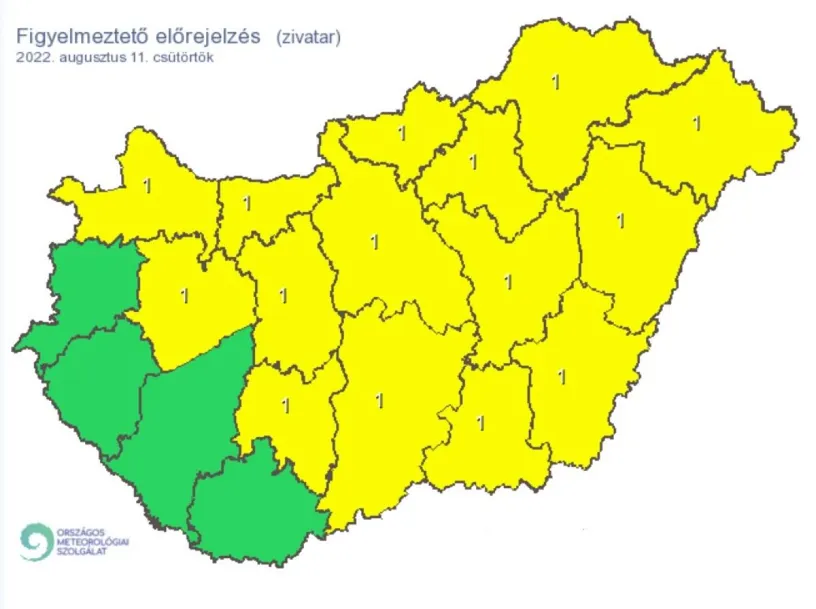 Csütörtök napközben egy északkelet felől érkező hidegörvény a késő délelőtti, déli órákban hozza meg a zivatarokat. A zivatarokat elsősorban jégeső (ált. 1-2 cm-t nem meghaladó méretű), viharos (> 60-65 km/h) széllökések kísérhetik, de intenzív csapadék (rövidebb idő alatt ~10-20 mm) is előfordulhat - figyelmeztet az OMSZ.
