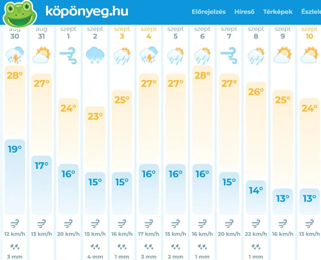Szombaton változóan felhős időre van kilátás, délutántól több felhővel. Elszórtan fordul elő zápor. 26 fok körül alakul a csúcshőmérséklet – írja a Köpönyeg.