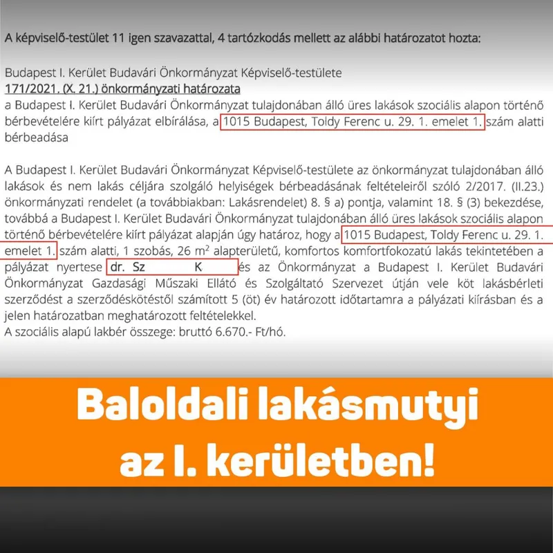 A lakhatási pályázat feltétele azonban, hogy a pályázó minimum egy éve rendelkezzen I. kerületi bejelentett lakcímmel. A nyertes ügyvédnő által megadott lakcímről azonban kiderült, hogy az ott álló épületet már évekkel ezelőtt elbontották, a helyén pedig éppen egy új építésű társasházat húznak fel, magyarul kamu címmel adta be a pályázatot, amiről a polgármesternek is illett tudnia.