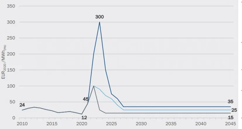 Az első eset - magas árpálya - azt feltételezi, hogy a gáz nagykereskedelmi árak a következő év folyamán megawattóránként 500 euró felettiek lehetnek, és csak ezután esnek újra. A becslés azon a feltételezésen alapul , hogy Oroszország leállítja a gázellátást.