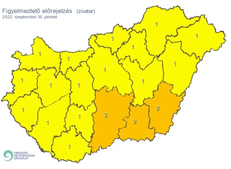 Pénteken a csapadékrendszer fokozatosan kelet, északkelet felé vonul, majd mögötte átmeneti szünetet követően újabb záporos, zivataros gócok képződhetnek - figyelmeztetnek a meteorológusok. Az egész országban elsőfokú riasztás van érvényben, kivéve Bács-Kiskun, Békés és Csongrád-Csanád megyében másodfokú riasztás van érvényben.