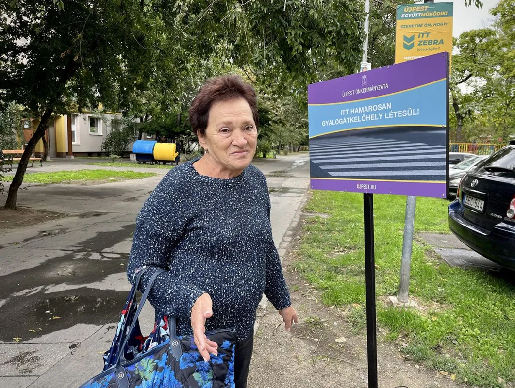 Nagy Lászlóné: „Ebben a kereszteződésben már nagyon régóta kellene, hogy legyen zebra. Én itt lakom a környéken, de ezt a táblát, hogy itt zebra lesz, csak pár napja helyezték ki, pedig forgalmas környék, gyerekek jönnek-mennek.”