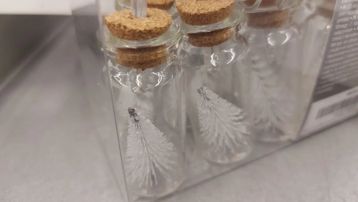 Apropó fehér karácsonyfa! Az egyik hangulatos karácsonyi izzósor apró üvegcsékből áll, a bennük látható aprócska fehér fenyőket felülről meleg fehér lámpácska világítja meg.