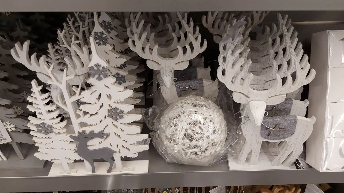Fehér a téli erdei jelenetet ábrázoló fadekoráció, melytől egyedül a hópelyhek és a szarvas sziluettjének szürke színvilága üt el, sőt, az egyik üzletben már műfenyőt is láttunk – természetesen fehéret.