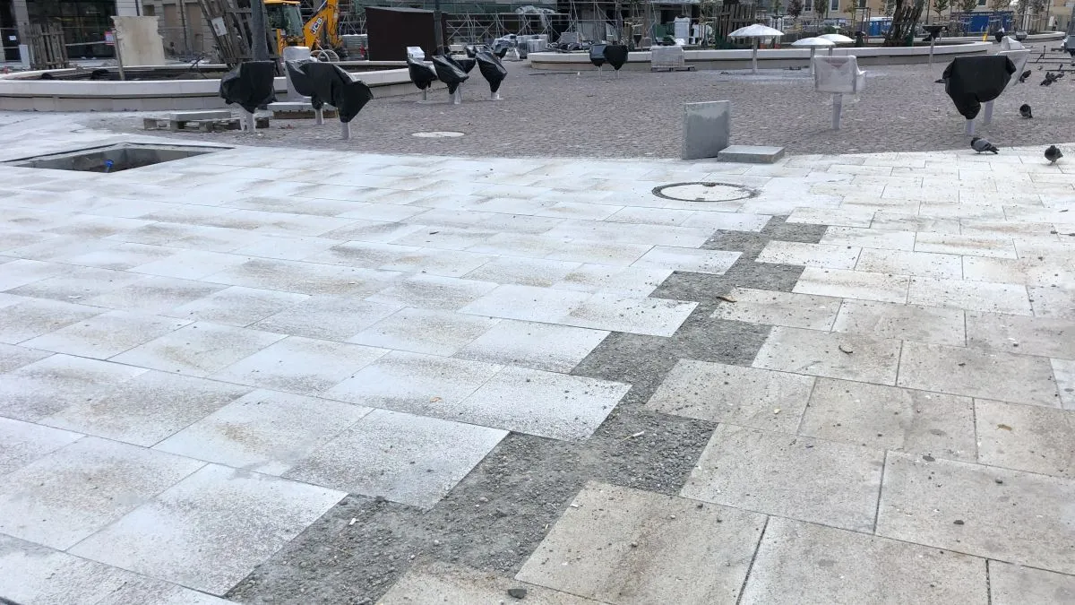 A helyszínen tapasztaltak alapján az tűnik igen valószínűnek, hogy a tér két oldaláról kezdték el lerakni a járólapokat, melyek minősége szemre is elég gyatra, ráadásul még színben is eltérnek. Mire találkoztak középen, kiderülhetett, hogy nem passzolnak a lapok egymásba. Ahelyett, hogy esztétikus munkára törekedve lapokat vágtak volna megfelelő méretre, a könnyebb megoldást választva inkább betonnal öntötték ki a területet.