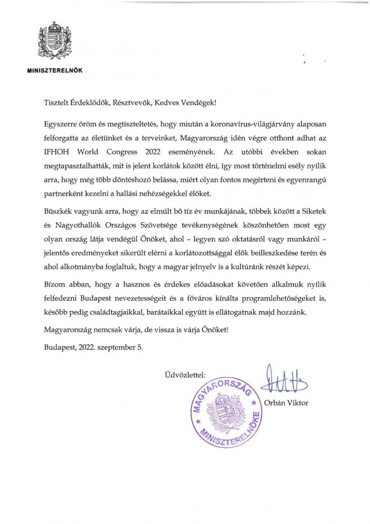 Büszkék vagyunk arra, hogy az elmúlt bő tíz év munkájának, többek között a Siketek és Nagyothallók Országos Szövetsége tevékenységének köszönhetően most egy olyan ország látja vendégül önöket, ahol - legyen szó oktatásról vagy munkáról - jelentős eredményeket sikerült elérni a korlátozottsággal élők beilleszkedése terén, és ahol alkotmányba foglaltuk, hogy a magyar jelnyelv is a kultúránk részét képezi