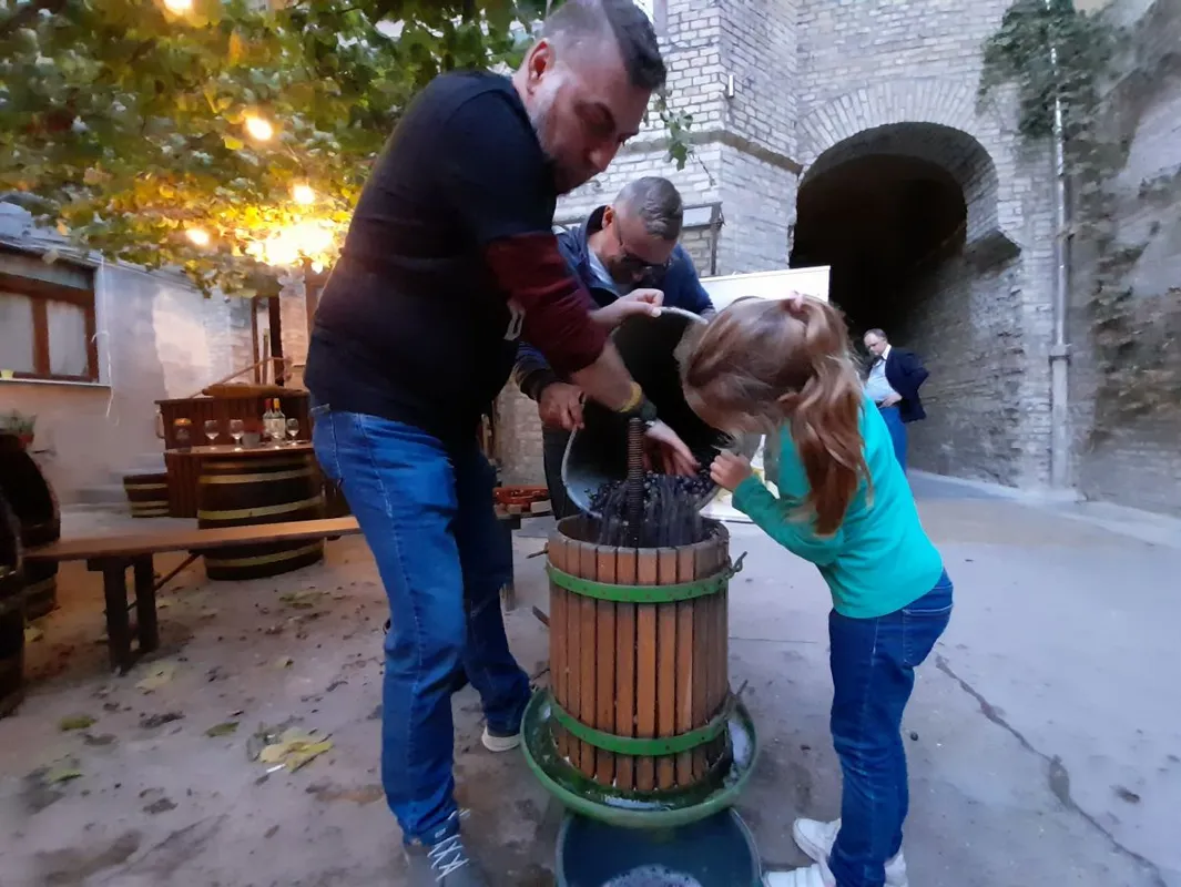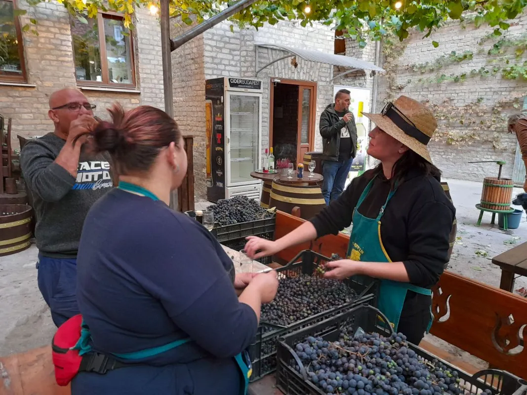 Szüretelőktől nyüzsgött az udvar: gondos kezek szedték az első emelet magasságáig érő vastraverzekre felfuttatott szőlő kéklő fürtjeit. Mások mások bogyózták és csumázták a termést. Kicsit odébb kézi préssel sajtolták ki a szőlő levét, hogy aztán az édes nedű tovább vándoroljon a pincébe, ahol a borkészítés további fázisai következtek.