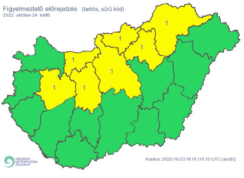 Hétfőn rétegfelhős időre számíthatunk az ország északi, északkeleti felén. Délen, délnyugaton inkább fátyolfelhők szűrik a napsütés. Estefelé északnyugat felől elszórtan alakul ki eső, zápor. 16 és 25 fok között változik a hőmérséklet - délkeleten lesz a melegebb idő. Hétfőre az Országos Meteorológiai Szolgálat több megyére is figyelmeztető előrejelzést adott ki a tartós, sűrű köd miatt.