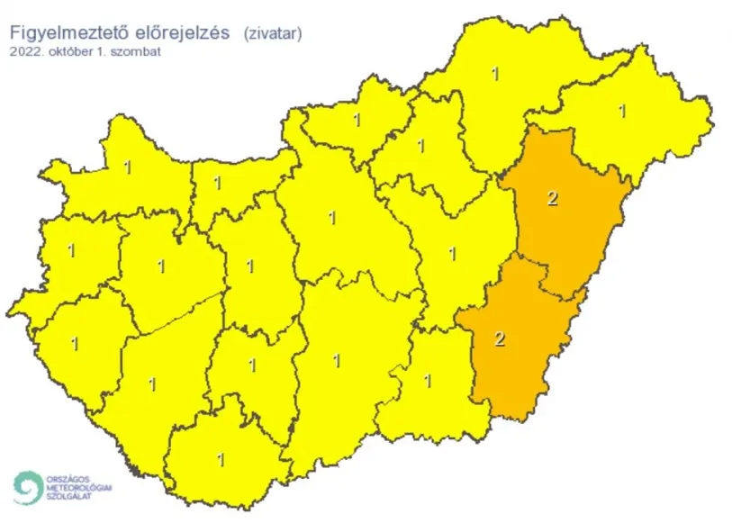 Az egész országra elsőfokú riasztást adtak ki, kivéve Békés és Hajdú-Bihar megyékben, ahol másodfokú riasztás van érvényben. Elsődleges veszélyforrást a villámlás jelent, emellett esetenként szélerősödés, jégeső előfordulhat - figyelmeztetnek a meteorológusok.