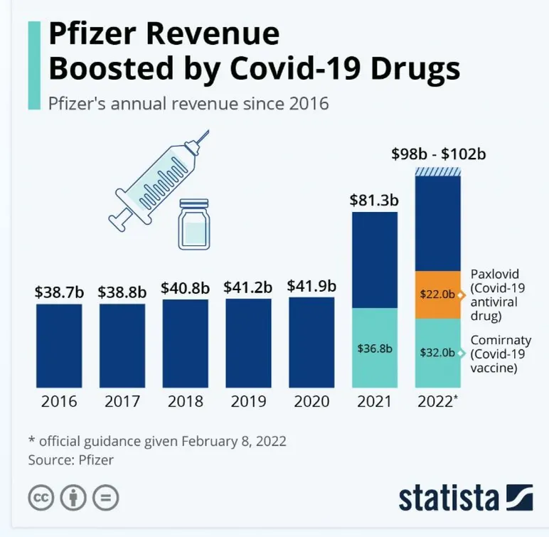 Amint a Pfizer által 2022. február 8-án közzétett éves eredmények alapján készített táblázat egyértelműen mutatja, a Pfizer bevételeit a Covid-19 vakcinák növelték , és ezek az eredmények drámaian magasabbak, mint a korábbi években. Emellett a teljes forgalomból 36 milliárdot a covid vakcinák generáltak. Vagyis, az európai adófizetők finanszírozzák a Pfizer részvényesei és vezetői (és kisebb mértékben a BioNTech) profitjának nagy részét.