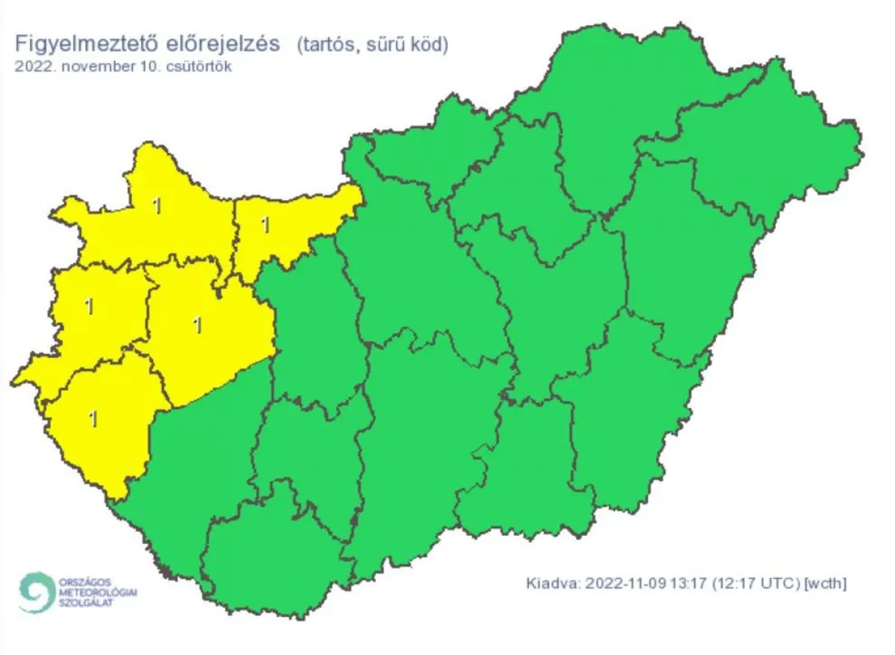 Az Országos Meteorológiai Szolgálat az ország nyugati felére elsőfokú figyelmeztetést adott ki a köd miatt.