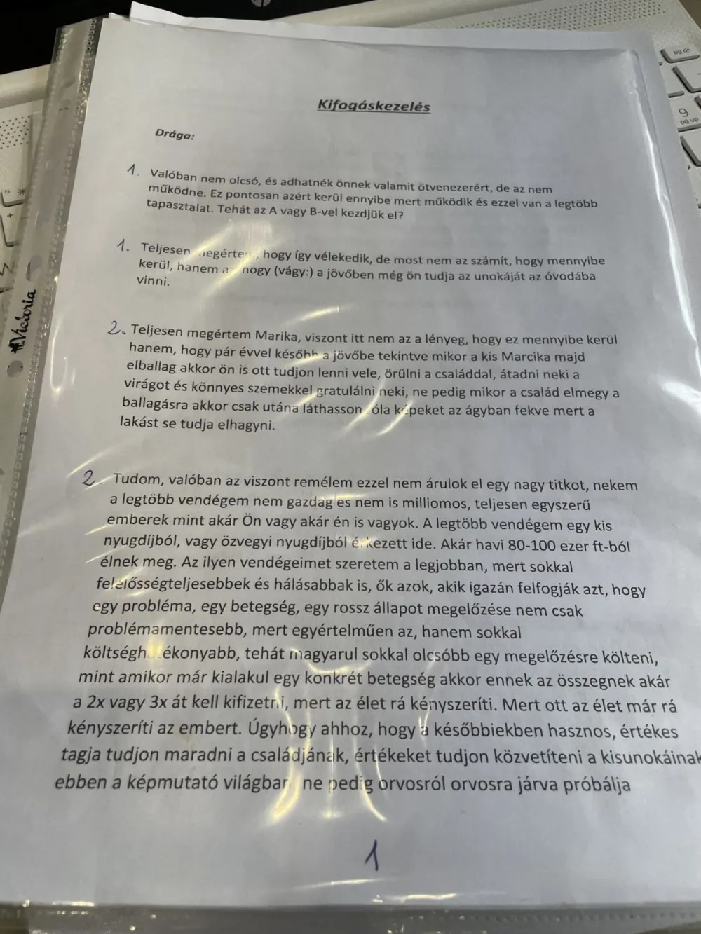 „A lézerórát ma is használja anyukám. A garanciában foglaltakat az egészségközpont velem szemben teljesítette. Az óra nagyon drága volt, úgy emlékszem, lealkudva 150 000 forint. Akkoriban az emagon hasonló pár tízezer forint volt” – mondja, majd hozzáteszi, hogy nem erőszakoltak rá semmit. „Minden ember a központban maga kipróbálhatta, eldönthette, hogy akarja-e és van-e pénze rá. Mindazonáltal sokan vásároltak és az ingyen kezelésekre is sokan jártak” – meséli. Azt is sejti, hogy az egészségi állapotukban semmiféle változás nem lesz a 150 ezres órától, mégis azt érzi, hátha. „Általában nehezen ugrok efféle vásárlásba. A lézeróra állítólag az érben gyorsabb vérmozgást eredményez, ami az érfalakra tapadt meszesedést, érszűkületet segít lassítani, jó esetben az erek karbantartását segíti. Anyukám naponta 15 percet használja, 87 éves, ártani nem fog neki, ha nem is használ” – elmélkedik. Őt minden bizonnyal meggyőzték, Mária még munkatársunknak is ajánlotta, hogy vegyen részt egy felmérésen. „Szoktak rendszeresen a Facebookon is hirdetni, ezek ingyenes állapotfelmérések, a kezébe is adják a papírt, így még aktuálisabb lesz” – győzködött.