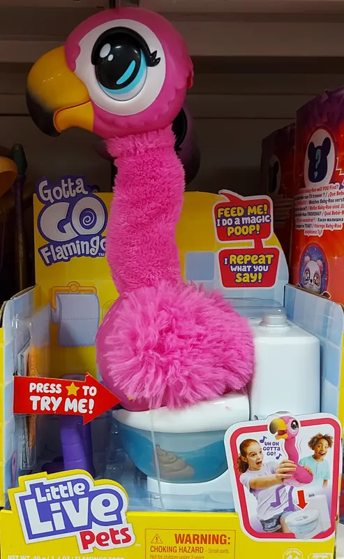 Micsoda színösszhang! Potyi, a flamingó esetében a lila lábak mellett a rózsaszín az uralkodó – hiába no, lányos játékról van szó, de a két vezérszín mellett megjelenik a narancssárga is. A színes játékmadár eledele, és ürüléke is ebben a színben pompázik. Merthogy ennél a játéknál a nagydolog az igazi nagy dolog!