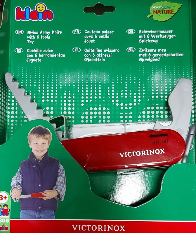 Kés, villa, olló – gyerek kezébe nem való. Tudják ezt jól a játékgyártók, így aztán a mondókában nem szereplő eszközökből kínálnak gyerekbarát változatot. Ilyen vidámság a kölyköknek készített svájci bicska, mely jóval nagyobb az eredetinél, tehát zsebbe nem fér, viszont nem sok mindenre jó. Talán csak a sörnyitó része. Vagy az sem.
