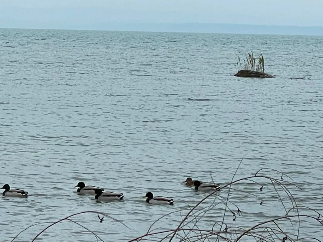 A szigetecske méretét jól érzékeltetik a part közelében úszkáló tőkés récék.